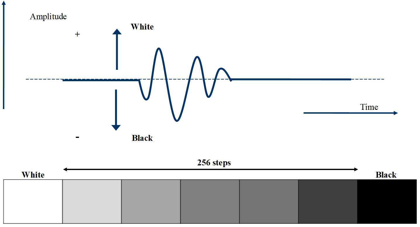 La rappresentazione grafica B-Scan si basa sulla conversione dell'onda in radiofrequenza in scala di grigi.
